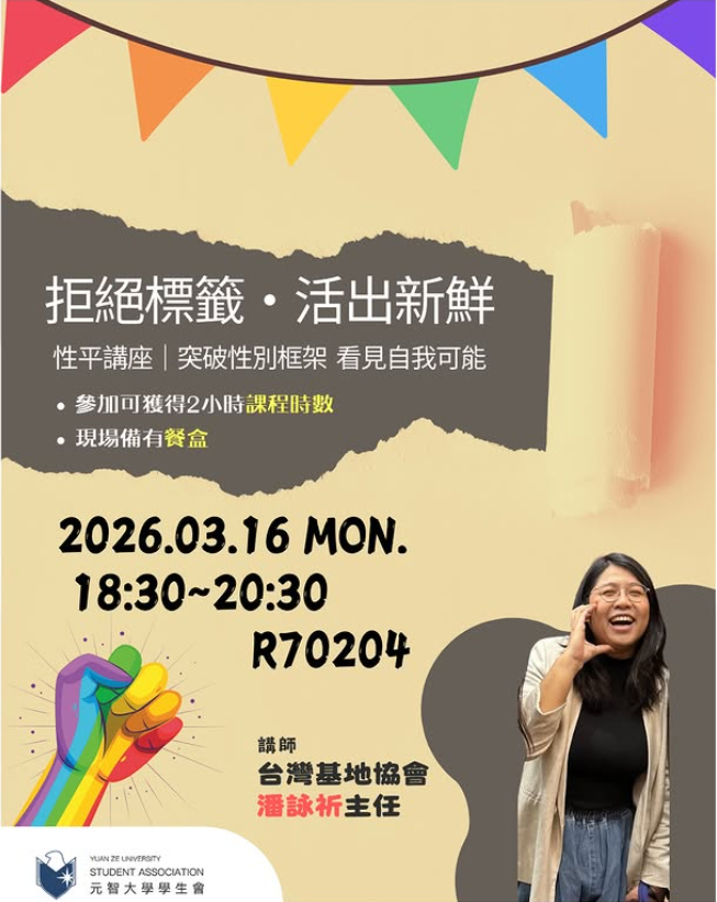 如果你對性別議題有興趣,或想更了解校園中的性平議題,歡迎一起來參與這場講座,一起拒絕標籤,活出屬於自己的樣子。
